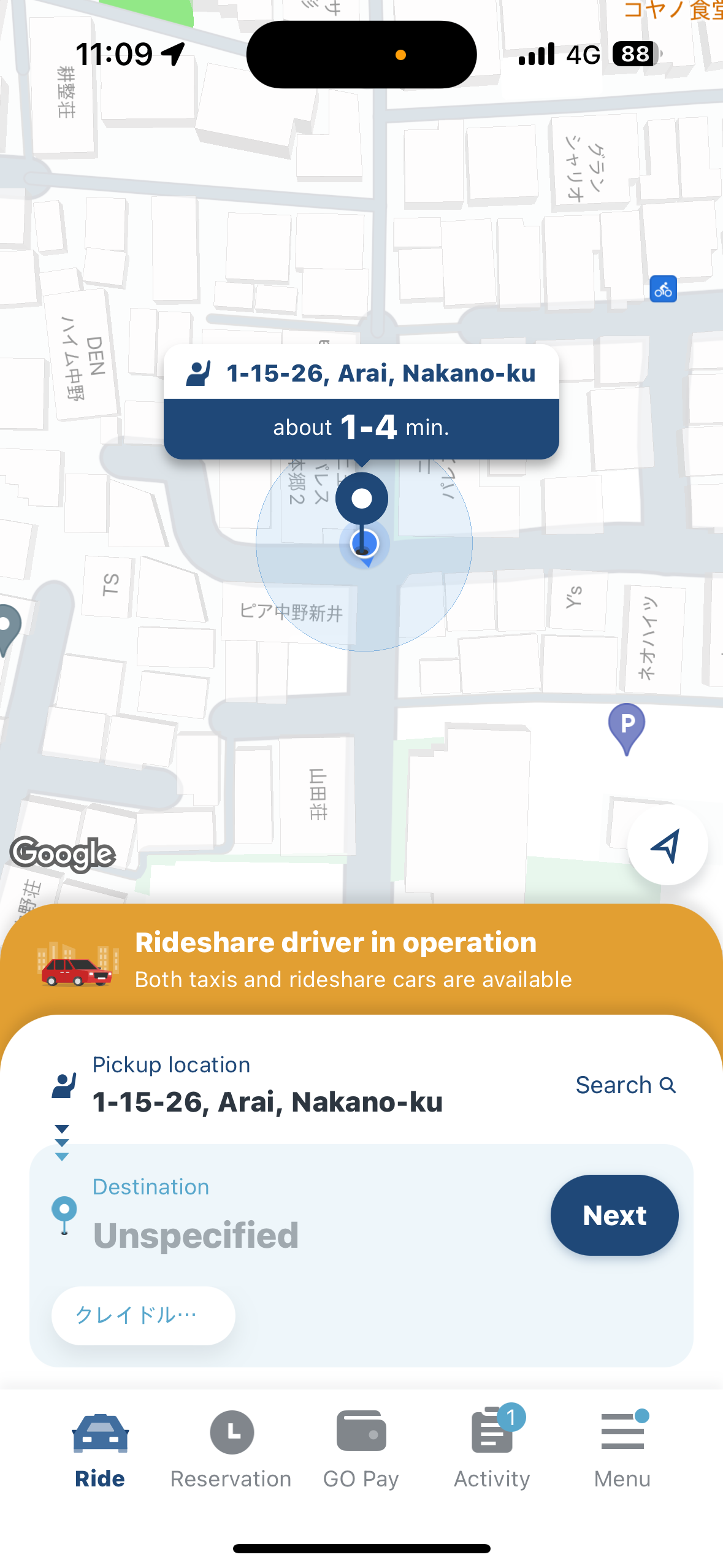 위치를 정하고 부르면, 기사님이 배정되어 도착하십니다. 목적지를 입력할 수 있고, 미리 등록한 카드로 자동결제 됩니다.